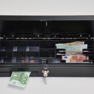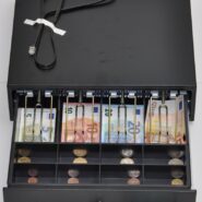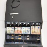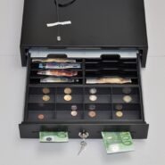 Pokladničná zásuvka s elektrickým ovládaním a otváraním na kľúč. Vnútro zásuvky obsahuje 8 priečinkov pre mince a 4 pre bankovky.