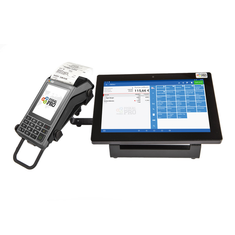 To všetko za cenu bežnej pokladnice, s výhodnými poplatkami za platby kartou. Riešenie plne kompatibilné s eKasa a v súlade s novou legislatívou. Komplexné pokladničné riešenie s profesionálnou Android aplikáciou FiskalPRO Mobile vhodné pre pevné prevádzky, predaj tovaru, služieb aj gastro segment. Uchytenie tabletu a platobného terminálu s fiškálnou tlačiarňou v nastaviteľnom a polohovateľnom stojane TWIN s otočným terminálom. Možnosť pripojenia externých zariadení/periférií (skener čiarových kódov, peňažná zásuvka, digitálna váha).